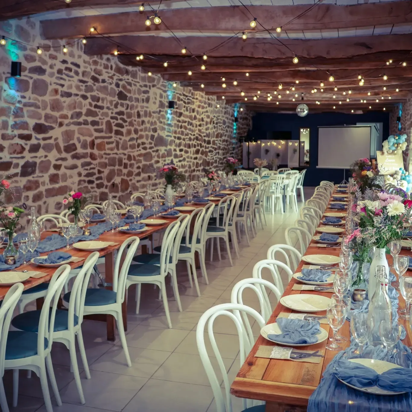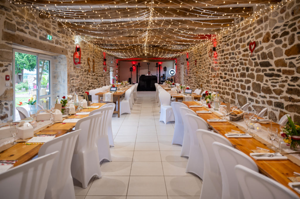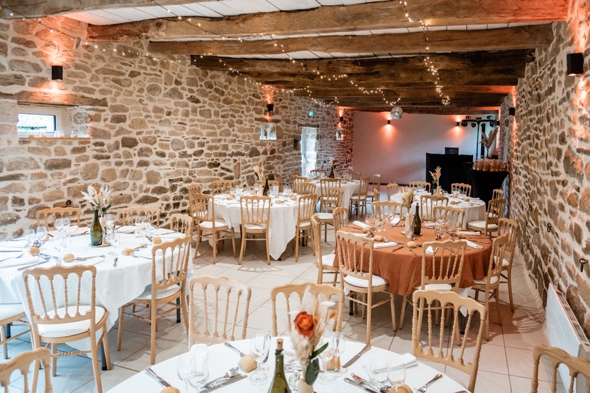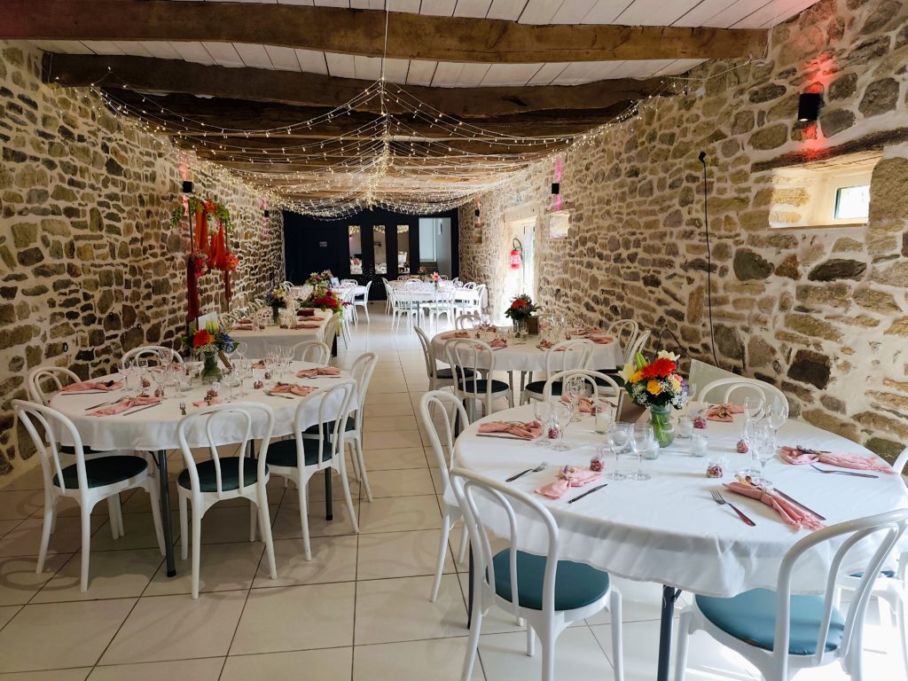 Ancienne ferme de 1870 en pierres de pays et entièrement rénovée, notre salle de réception aux poutres apparentes peut accueillir jusqu’à 100 personnes en banquet et 150 invités en cocktail.